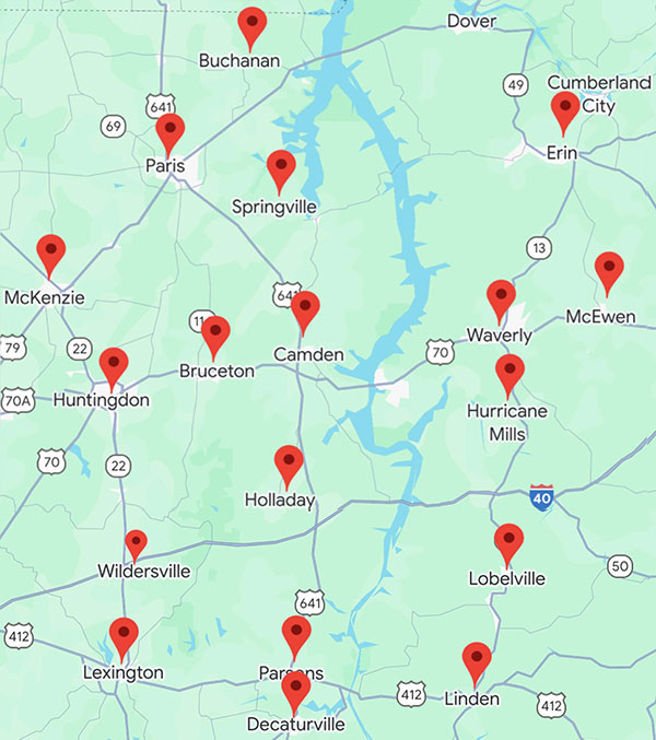Bruceton, TN, Buchanan, TN, Camden, TN, Cumberland City, TN, Decaturville, TN, Erin, TN, Hurricane Mills, TN, Holladay, TN, Huntingdon, TN, Jackson, TN, Lexington, TN, Linden, TN, Lobelville, TN, McEwen, TN, McKenzie, TN, Paris, TN, Parsens, TN, Springville, TN, Waverly, TN, Wildersville, TN, Benton County, TN, Carroll County, TN, Decatur County, TN, Dickson County, TN, Henry County, TN